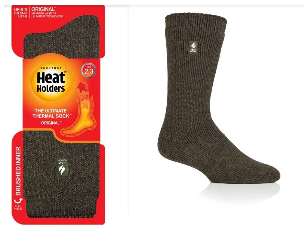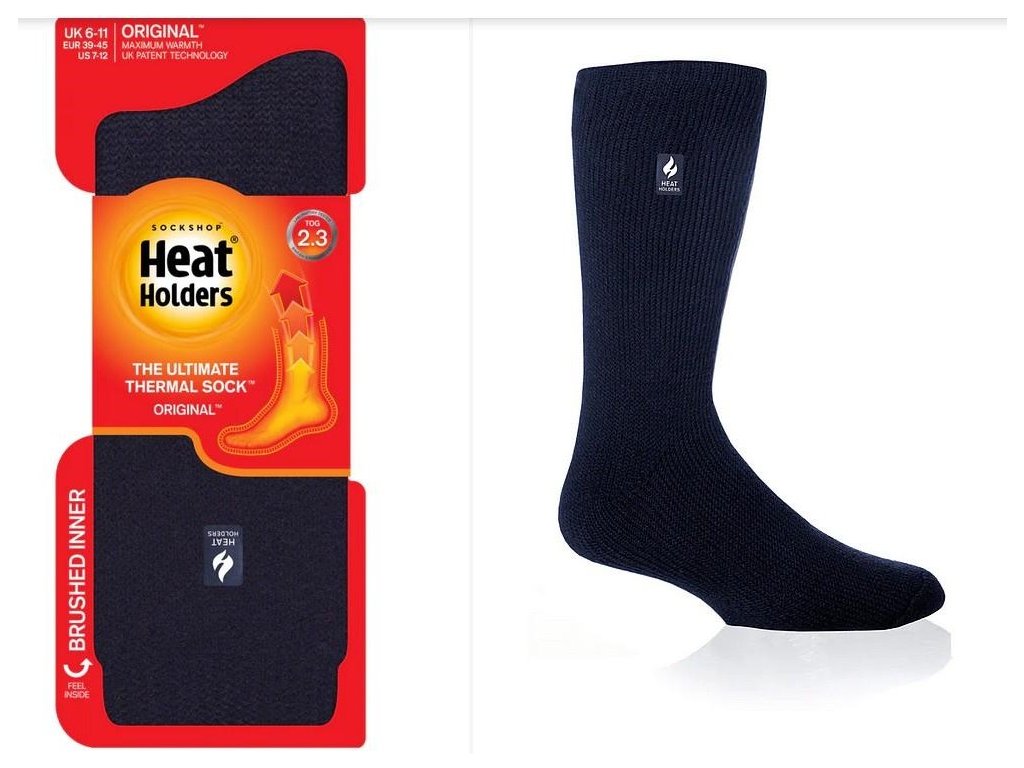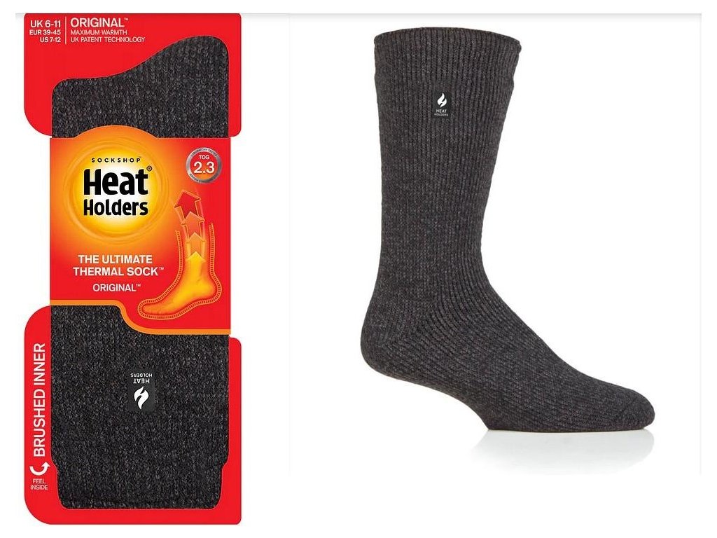 Jednobarevné silné zimní termo ponožky Heat Holders ORIGINAL jsou nejteplejší termo izolační ponožky v naší nabídce. Díky hrubým izolačním vláknům s dlouhými froté smyčkami a vyčesanému vnitřku ponožek, se zachycuje tělesné teplo v blízkosti pokožky mnohem déle a ve větším množství, čímž ponožky lépe a déle tepelně izolují chodidla a chrání je i proti tomu největšímu chladu. Jako kašmírový akryl dává ponožkám příjemný dotek, jemnost a extra pohodlí. Ponožky jsou jedny z nejvíce oblíbených v celé naší nabídce. TOG rating 2,3 - hodnocení tepelného odporu textilií, známeho jako izolační odpor, neboli výhřevnost. Čím je hodnota TOG vyšší, tím je vyšší hřejivosť. Testované podle britského standardu BS4745
